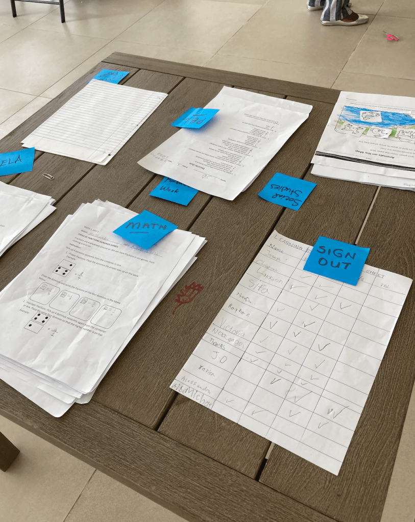 They instructed the students to choose what they wanted to work on and where they wanted to work and when the work was finished they should turn it in and sign off on what they completed.  Students loved it.  They embraced the independence and worked together to figure out the material.  The teachers were able to circulate and answer more specific questions.  Some students asked to do the more difficult work because they saw older kids working on it.  In this process teachers really appreciated the kind of support they were able to provide.